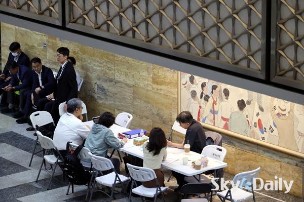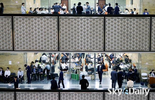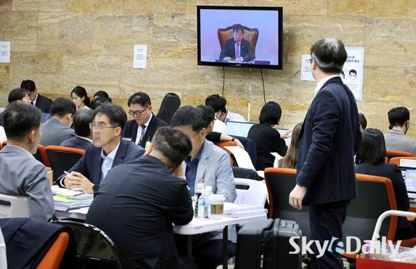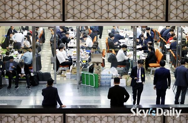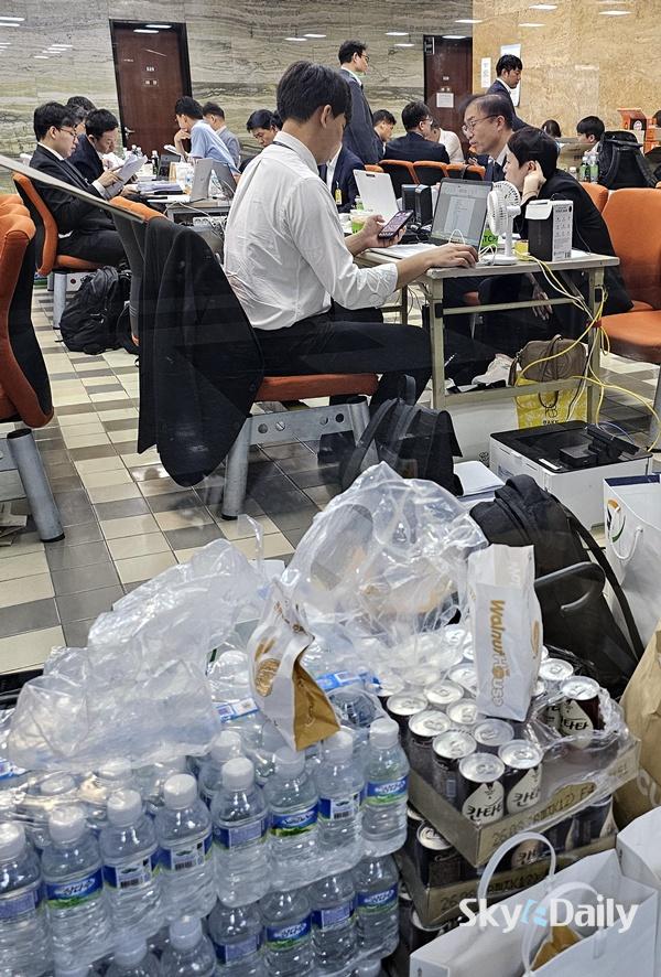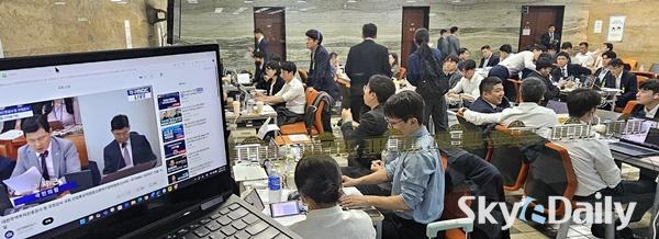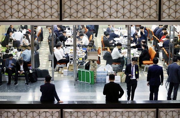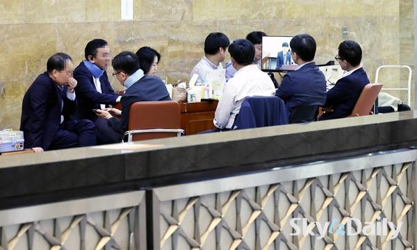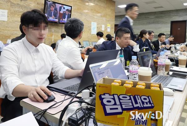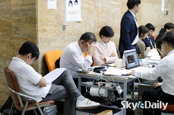 ¡ã 23´ë ±¹È¸ ±¹Á¤°¨»ç ´ÏÈê°ÀÎ 16ÀÏ, ±¹È¸ »óÀÓÀ§¿øÈ¸ ȸÀÇ½Ç ÁÖº¯¿¡¼­ °ø¹«¿ø°ú °ü°èÀÚµéÀÌ Á¢ÀÌ½Ä °£ÀÌ ÀÇÀÚ¿¡ ¾É°Å³ª Âɱ׸®°í ¾ÉÀº ä ³ëÆ®ºÏÀ» ÆîÄ¡°í ´äº¯ Áغñ¸¦ Çϰí ÀÖ´Ù. ¿©¾ß ¸ðµÎ ¿¬Áß ¡®»ó½Ã ±¹°¨¡¯ µµÀÔÀ» ÁÖÀå Çϰí ÀÖÁö¸¸ ½ÇÇöµÇÁö ¸øÇÑ Ã¤ ¸Å³â ¡®±¹°¨ ö¡¯ÀÌ¸é ¸ö»ìÀ» ¾Î¾Æ¾ß ÇÏ´Â ÁøÇ³°æÀÌ ¿¬ÃâµÇ°í ÀÖ´Ù. ÀÌÁ¾¿ø ±âÀÚ ¨Ï½ºÄ«À̵¥Àϸ®