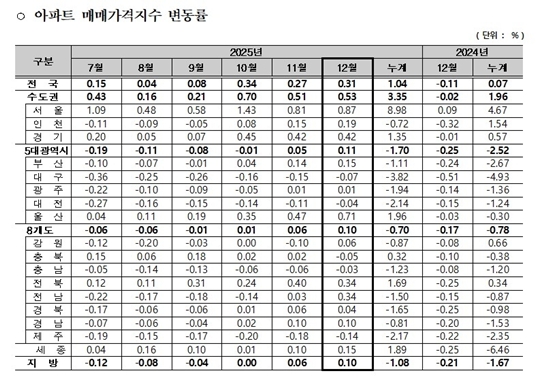 ¼öµµ±Ç Àüü·Îµµ »ó½Â¼¼°¡ À̾îÁ³´Ù. 12¿ù ¾ÆÆÄÆ® ±âÁØ °æ±â »ó½Â·üÀº 0.42%·Î Àü¿ù°ú °°¾Ò°í, ÀÎõÀº 0.19%·Î 0.04%Æ÷ÀÎÆ® È®´ëµÆ´Ù. ¼öµµ±Ç ¾ÆÆÄÆ® »ó½Â·üÀº 0.53%¸¦ ±â·ÏÇß´Ù. °æ±âµµ´Â ±ÔÁ¦Áö¿ªÀ¸·Î ¹­ÀÎ ¿ëÀÎ ¼öÁö±¸, ¼º³² ºÐ´ç±¸, ±¤¸í½Ã µîÀÌ °­¼¼¸¦ À̾¸ç ¿ù°£ »ó½Â·üÀÌ Àü¿ù°ú µ¿ÀÏÇÑ ¼öÁØÀ» À¯ÁöÇß´Ù. ºñ¼öµµ±Çµµ 12¿ù ¾ÆÆÄÆ® »ó½Â·üÀÌ 0.10%·Î Àü¿ù(0.06%) ´ëºñ È®´ëµÆ°í, Àü±¹ ¾ÆÆÄÆ® »ó½Â·üÀº 0.31%·Î 0.04%Æ÷ÀÎÆ® Ä¿Á³´Ù. Àü±¹ ÁÖÅÃÁ¾ÇÕ ¸Å¸Å°¡°ÝÀº 0.26% ¿Ã¶ó Àü¿ù(0.24%) ´ëºñ ¿À¸§ÆøÀÌ È®´ëµÆ´Ù.