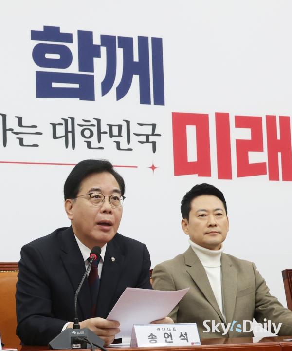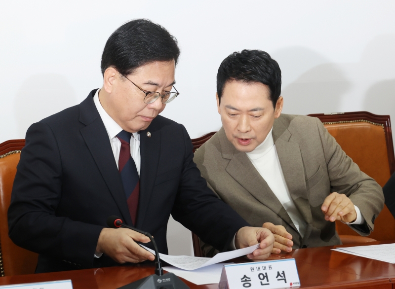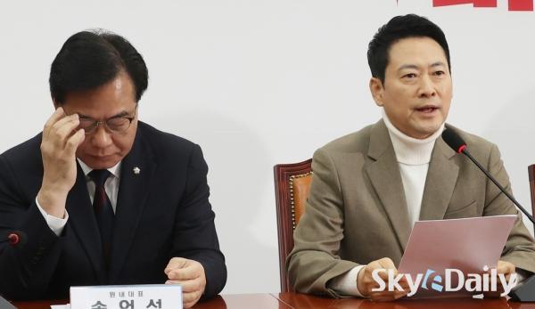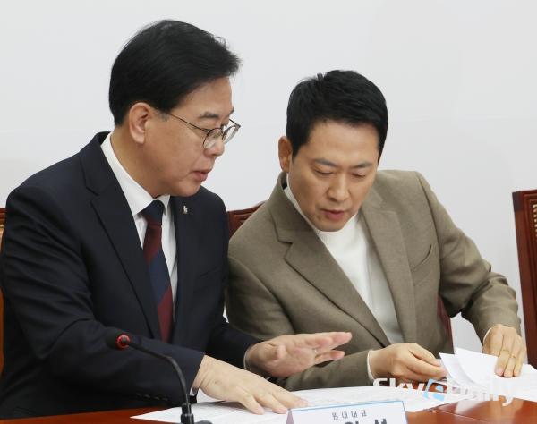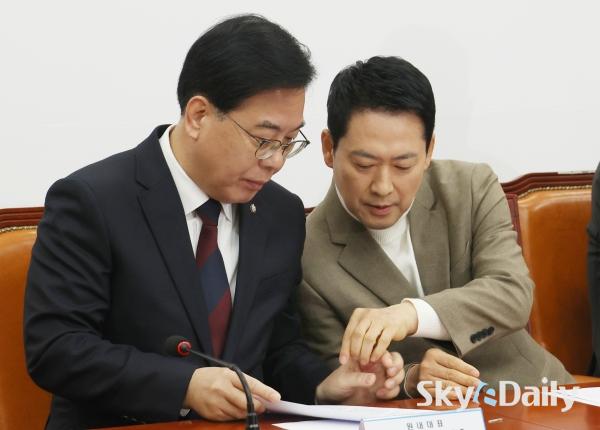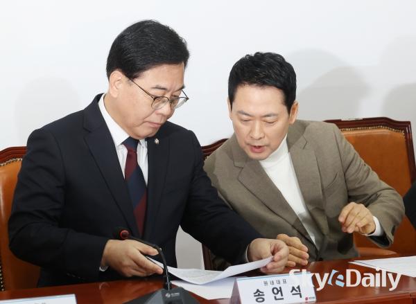 ¡ã À嵿Çõ ±¹¹ÎÀÇÈû ´ëÇ¥¿Í ¼Û¾ð¼® ¿ø³»´ëÇ¥°¡ 5ÀÏ ¼­¿ï ¿©Àǵµ ±¹È¸¿¡¼­ ¿­¸° ÃÖ°íÀ§¿øÈ¸ÀÇ¿¡¼­ ȸÀÇ ÀڷḦ º¸¸ç ´ëÈ­Çϰí ÀÖ´Ù. À̳¯ Àå ´ëÇ¥´Â ¿¬ÀÏ À̾îÁö´Â ÀÌÀç¸í ´ëÅë·ÉÀÇ ºÎµ¿»ê °ü·Ã ¸Þ½ÃÁö¿¡ ¡°ÀÌ ´ëÅë·É º»ÀÎÁ¶Â÷ Áý°ªÀÌ ¾È ¶³¾îÁø´Ù°í ¹ÏÀ¸´Ï ÆÈÁö ¾ÊÀ¸¸é¼­ ±¹¹ÎÇÑÅ×´Â ÆÈ¶ó°í ÇÑ´Ù¡±°í ºñÆÇÇß´Ù. ¹Ú¹Ì³ª ±âÀÚ ¨Ï½ºÄ«À̵¥Àϸ®